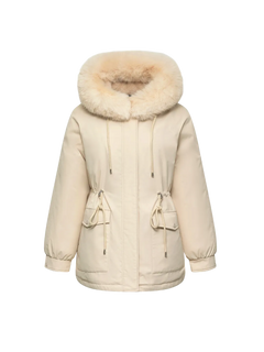 WarmCore™ Faux Fur Mid-Length Hooded Drawstring Parka With Adjustable Waist Belt Desig